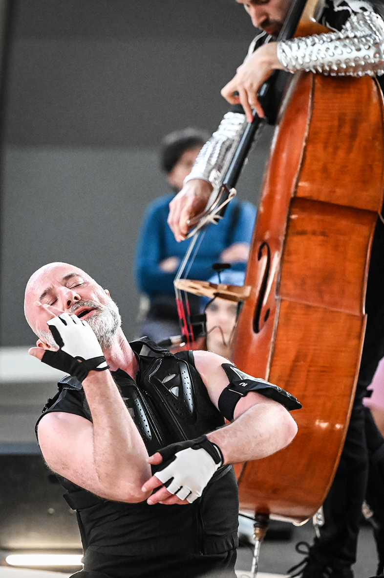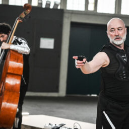 Choreographer and performer Alban Richard and composer and instrumentalist Florentin Ginot have embarked on a collaboration in the fullest sense of the word, co-authoring a piece that bring them together on stage. Borrowing its title from the novel A Sentimental Journey by writer Laurence Sterne, where “sentimental” means resistance to the supremacy of reason, A Sentimental Landscape plays on the loss of landmarks within a sound cartography. The duo’s research focuses on an intense musical composition, a polyphony of voices (spoken, blown) that activates and triggers movements, sounds, affects and emotions. In this shifting soundscape, double bass motifs, machine rhythms and loops leave no respite for the bodies of the performers. Prisoners of intertwined temporalities, the bodies endure Le dur désir de durer, as delineated by Paul Éluard: “Our bodies are against each other, we are down to earth. We are born from everywhere, we are without limits”. The piece creates and modulates an island of gestures, words and sounds, around which the audience takes its place. An autonomous island that can be set up in a theater, a museum, a gymnasium, an underground parking lot or in the heart of a hundred-year-old forest.